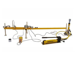 3.安置承載板及千斤頂 將承載板放置于測(cè)試點(diǎn)上,使承載板與地面完全接觸,必要時(shí)可鋪設(shè)一薄層干燥砂(2~3mm)或石膏膩?zhàn)樱瑫r(shí)利用承載板上水準(zhǔn)泡或水準(zhǔn)儀來(lái)調(diào)整承載板水平。 將反力裝置承載部位安置于承載板上方,并加以制動(dòng)。承載板外側(cè)邊緣與反力裝置支撐點(diǎn)之間的距離不得小于0.75m。將千斤頂放在承載板的中心位置,使千斤頂保持垂直。用加長(zhǎng)桿和調(diào)節(jié)絲桿使千斤頂頂端球鉸座與反力裝置承載部位緊貼。